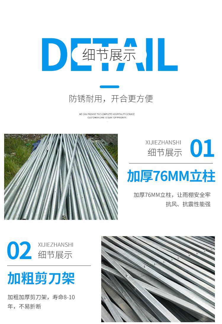 二、布料:刀刮布/汽車帆布,(防水、防曬、耐磨,抗老化),本產品斷裂強力、撕裂伸長率、撕破強力大大優于傳統篷布。推拉式雨棚布采用進口熱燙壓合機技術,非常牢固耐用,接合處不會漏雨,好的篷布非常關鍵,決定一個雨棚的使用壽命的往往就是篷布。